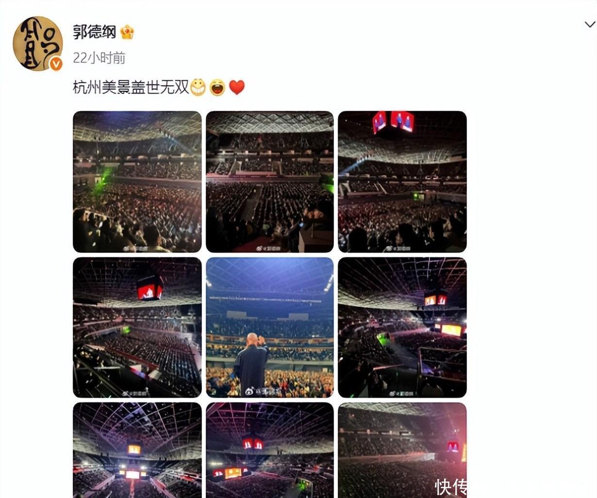 后面还有大笑和爱心表情,看来他是真喜欢杭州景色。下面配的照片,是他说相声时场馆内的照片。照片让人十分惊讶,场馆内座无虚席,密密麻麻全是人,这场景就像演唱会一样热闹,没想到会这么火。