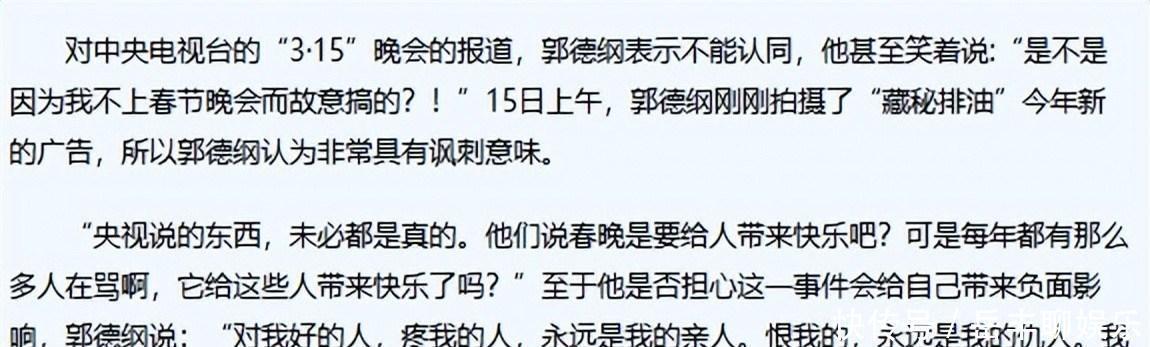 除和徒弟产生矛盾外,姜昆等人倡议抵制“三俗”,郭德纲部分内容低俗的相声被点名。他没回应此事,反倒编了《我要反三俗》来调侃。此外,他还涉及虚假代言问题。之前他曾代言一款减肥药,声称有神奇减肥效果,结果被3·15晚会曝光其宣传为虚假内容。